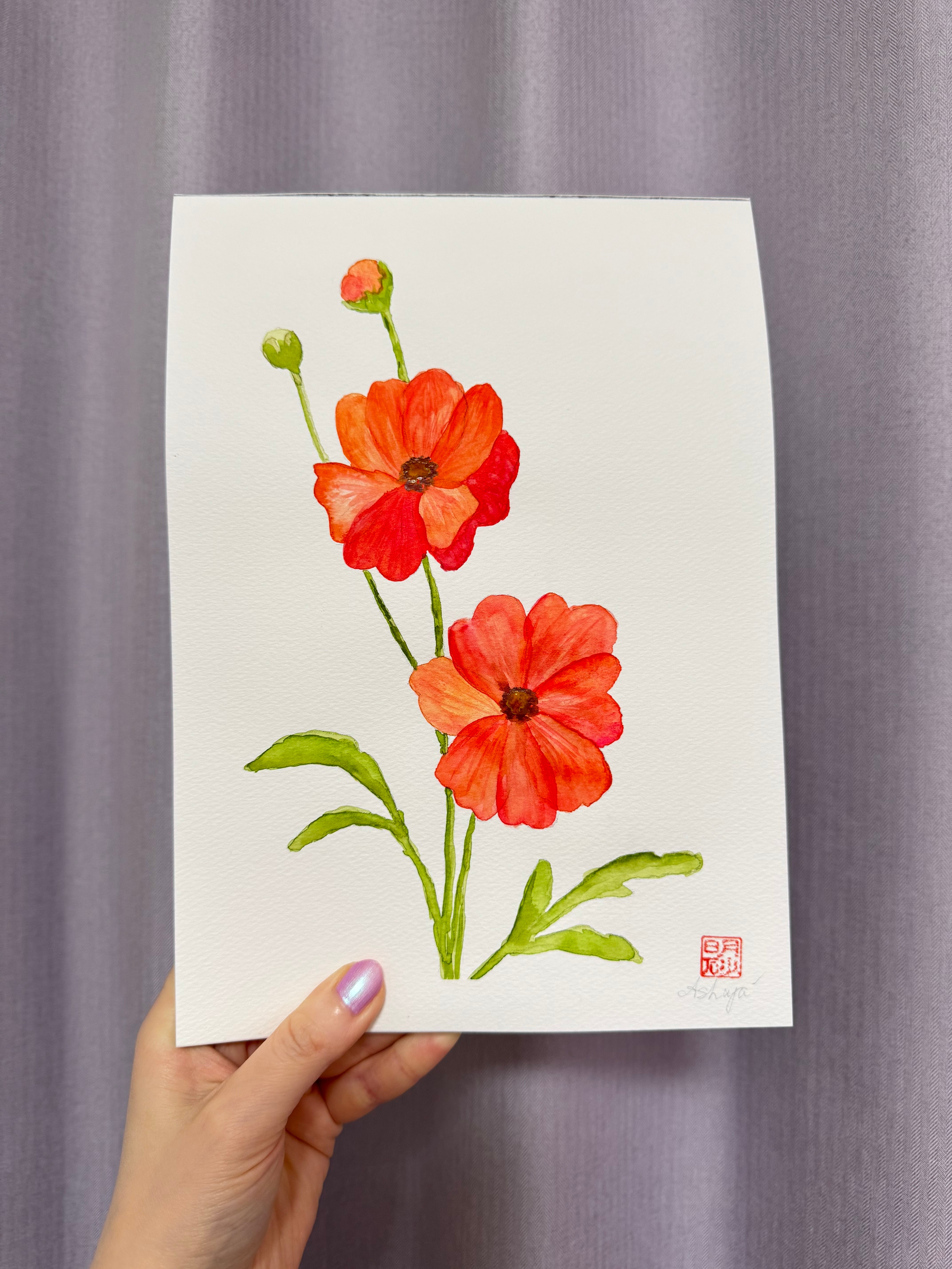 春の陽ざしをいっぱいに浴びて咲くラナンキュラスの花。ふっくらとした花びらの重なりと鮮やかな赤橙色のグラデーションが、見る人の心を温かく包みこみます。まるで小さな太陽のように、そっと希望を届けてくれる一輪の輝き。シンプルな構図の中に、やさしい春の息吹を込めました。
