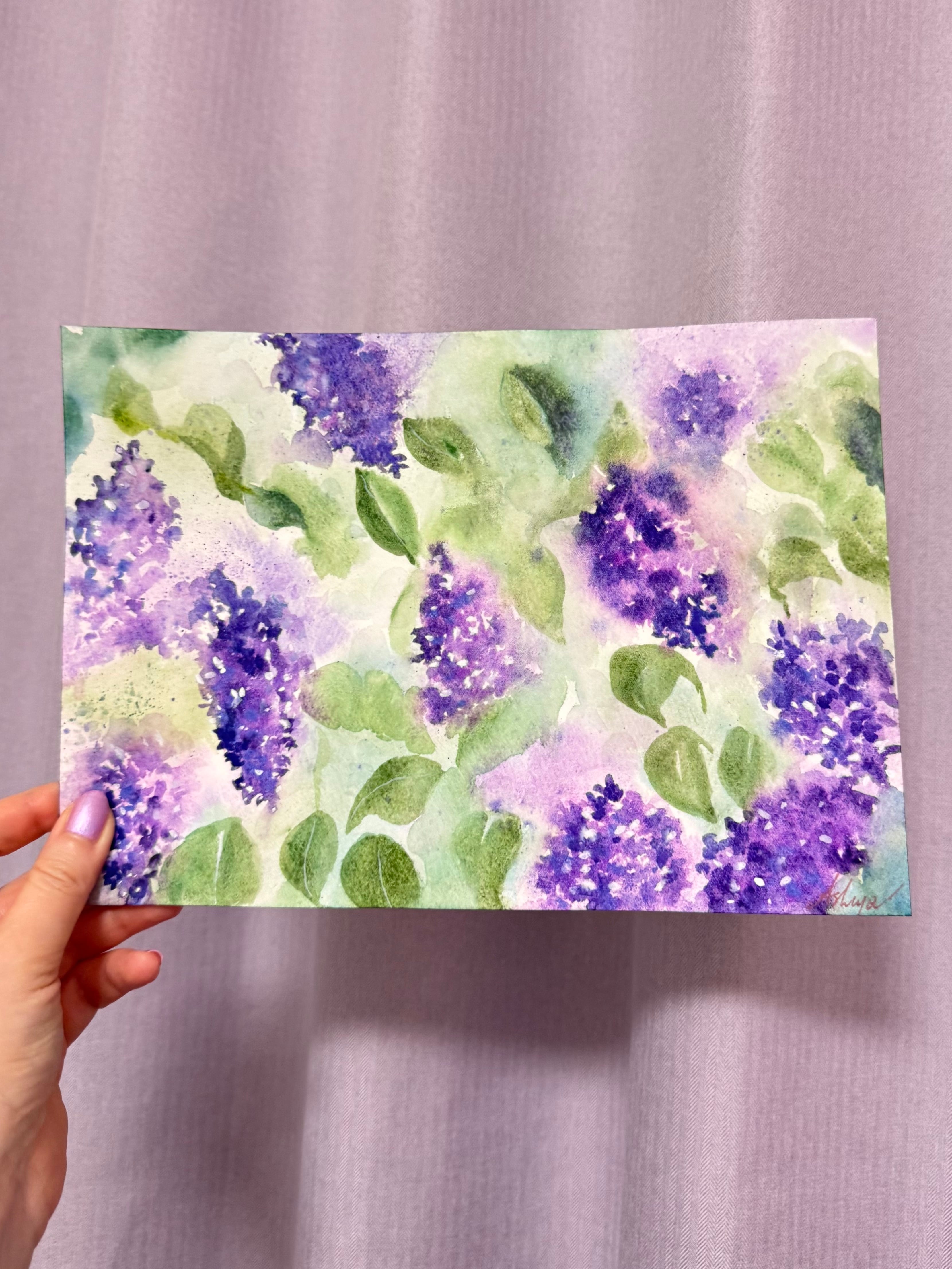 やわらかな水彩のにじみで描かれた、ライラックの花々の作品です。