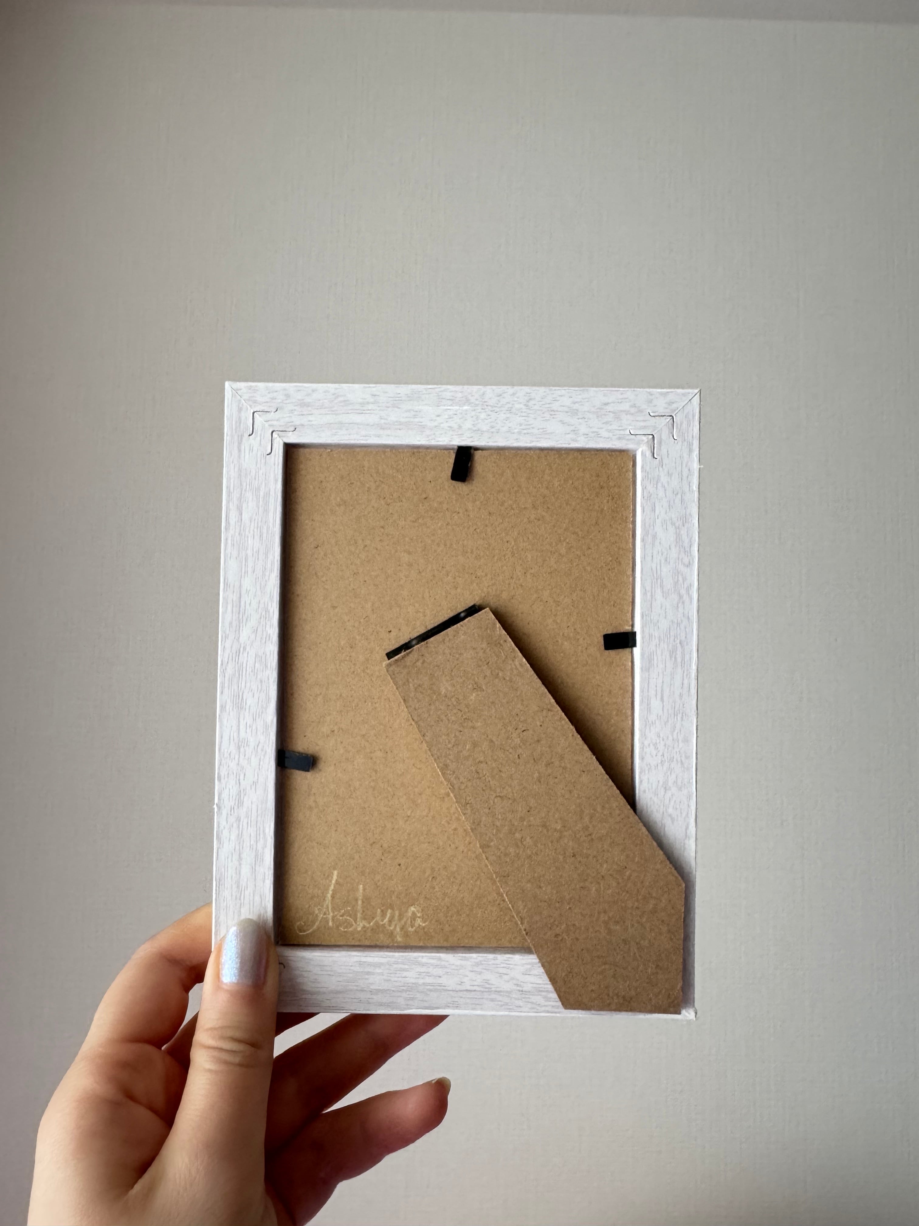 フレームまでも絵の一部として取り込むことで、まるで“ひとつの世界”を切り取ったような構成に。甘さと静けさが同居する、不思議なバランスの中で、勿忘草の持つ「忘れないで」という想いが、やさしく語りかけてくる作品です。