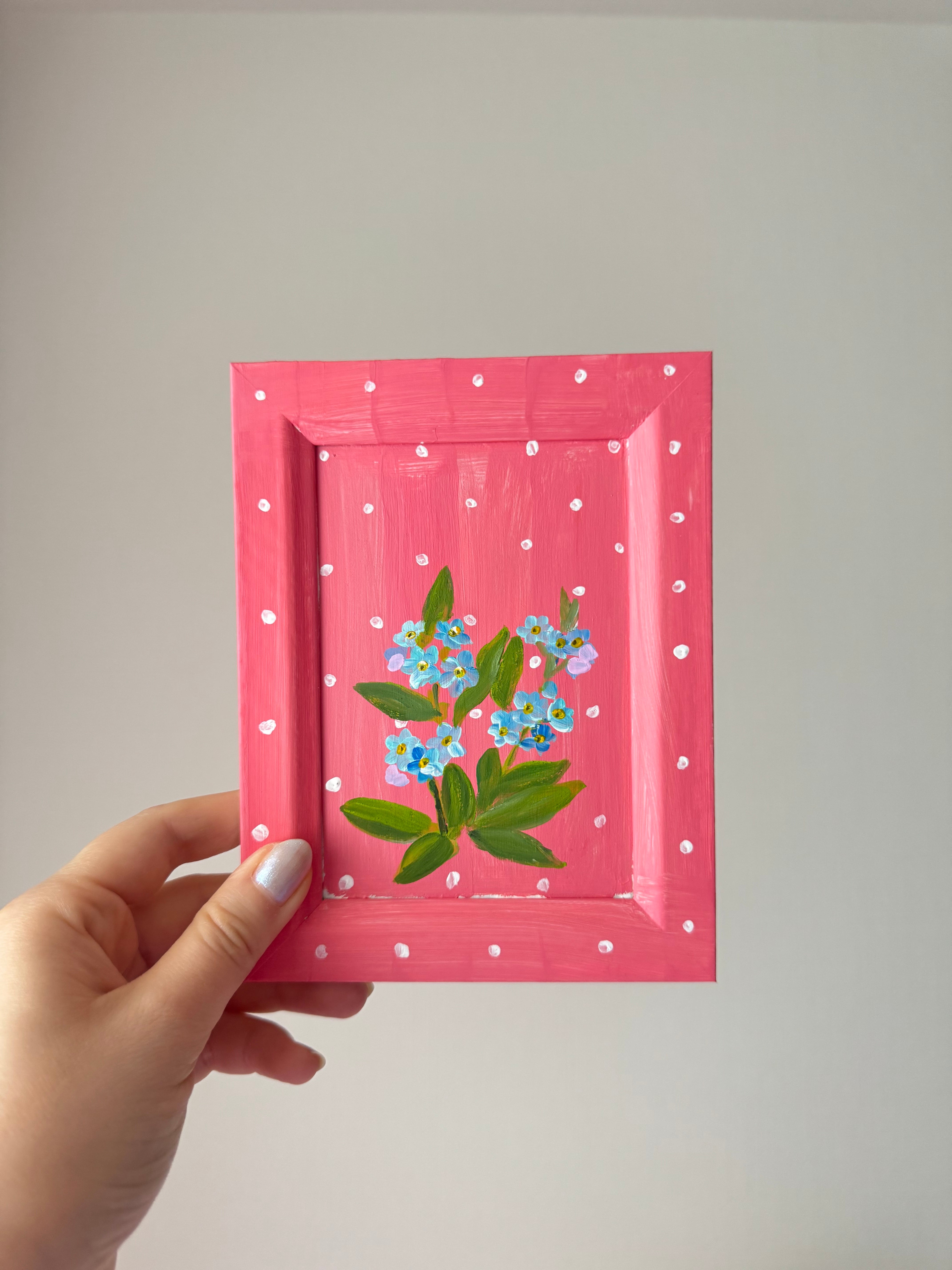 鮮やかな苺色のフレームの中に、小さな勿忘草がそっと咲いています。